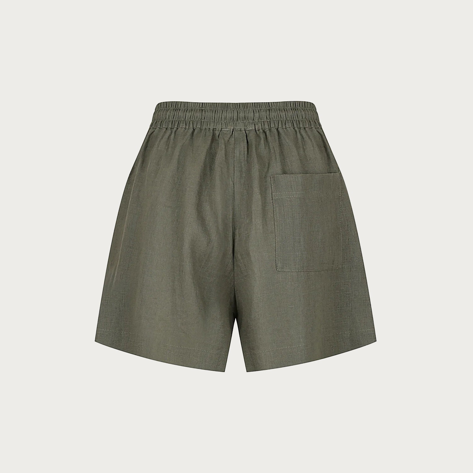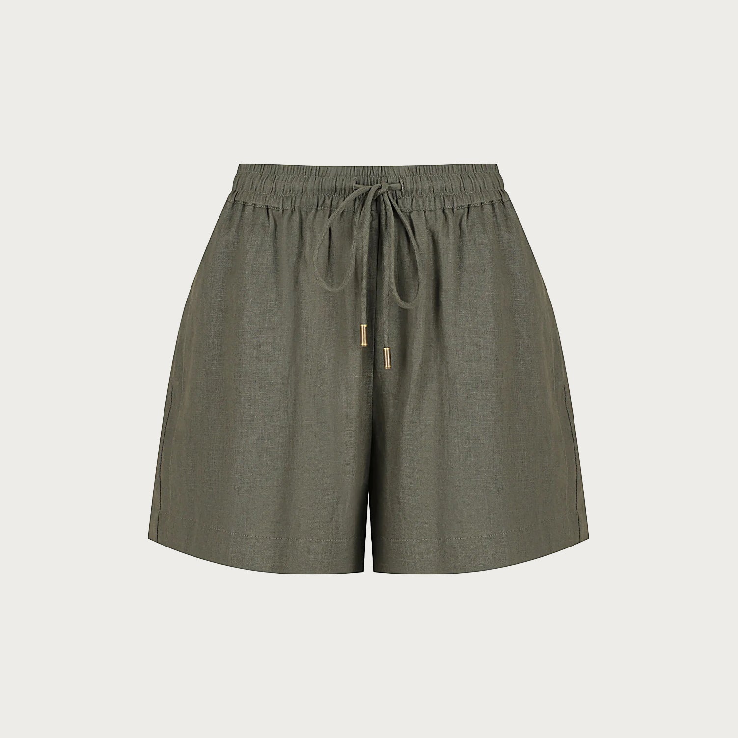 A relaxed but elevated linen pull on short. Premium 100% light-weight linen for warmer days in a beautiful forest green. Elevated design with side pockets, self-fabric drawcords with signature brass aglets. Pair with our matching Margot Shirt for an easy summer go-to set. Perfect for a summer holiday. Alternatively, style with our Jamie Tshirt or a white tank for a chic casual look.