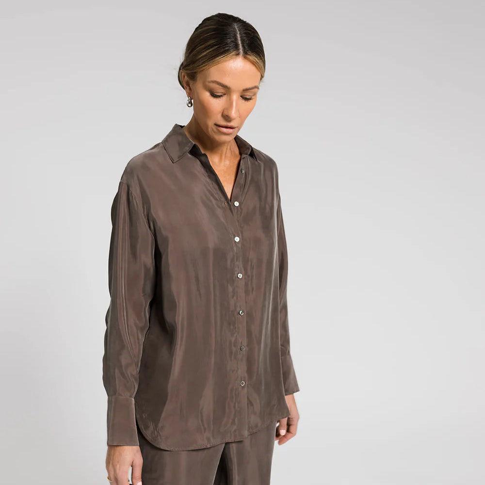 This piece is incredibly luxurious! A modern feminine shape in the most luxurious Cupro Viscose blend. An elevated shirt that looks and feels like pure luxury from the moment you slip your arms into the sleeves.