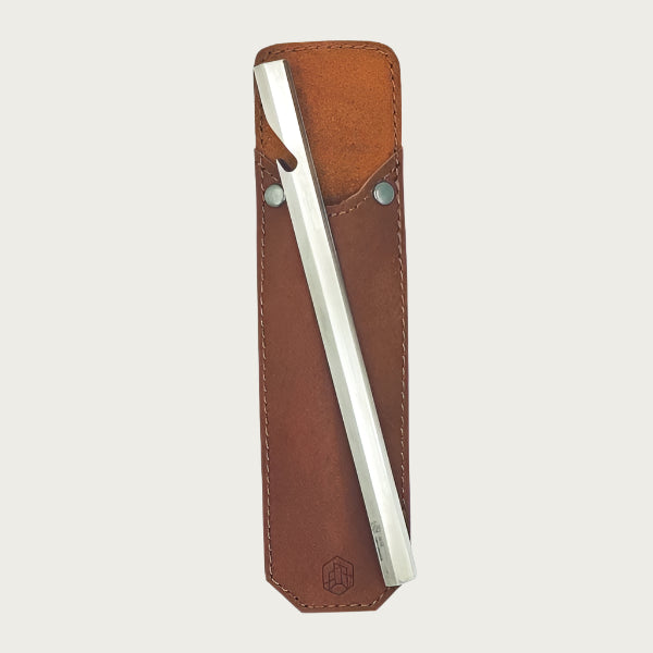 Heavy weight and heavy duty bottle opener in burned stainless steel that comes with a custom buffalo leather sleeve in a black cardboard gift box.
