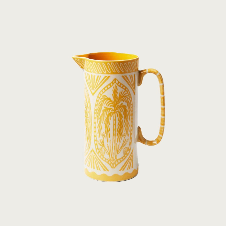 Each Del Sol Jug is hand painted with tropical palms and native birds, giving it a playful and vibrant touch. The mustard colour adds a sunny pop of colour to any meal, making it the perfect statement piece for sangria with the girls to water on your desk or fill with flowers when not in use on the table.
