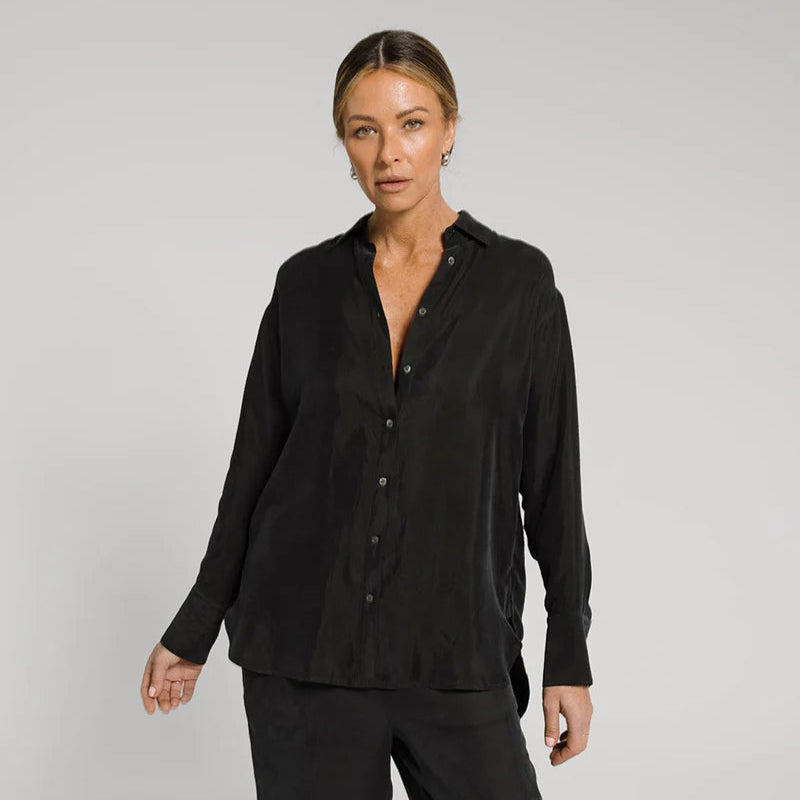 This piece is incredibly luxurious! A modern feminine shape in the most luxurious Cupro Viscose blend. An elevated shirt that looks and feels like pure luxury from the moment you slip your arms into the sleeves.