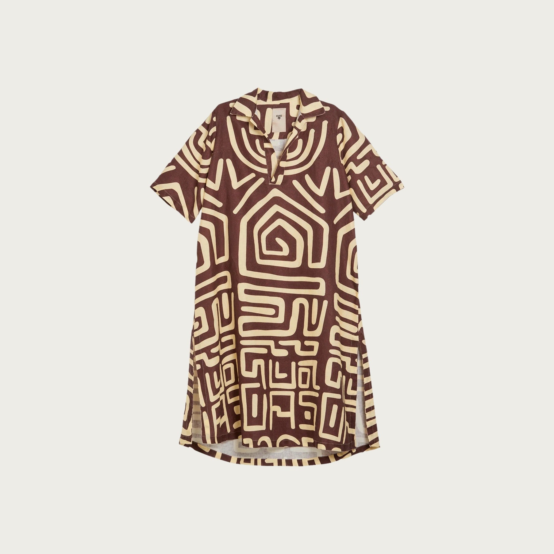 The Kalahara print in deep burgundy and creamy white takes inspiration from ancient cave paintings. The Papaya dress has an oversized fit and mid-length sleeves. The dress is completed with high-cut slits on the sides of the dress - it is designed for movement. Made in 100% heavyweight linen that lets your body breathe, the Papaya dress contains an open collar and a deep slit neckline.