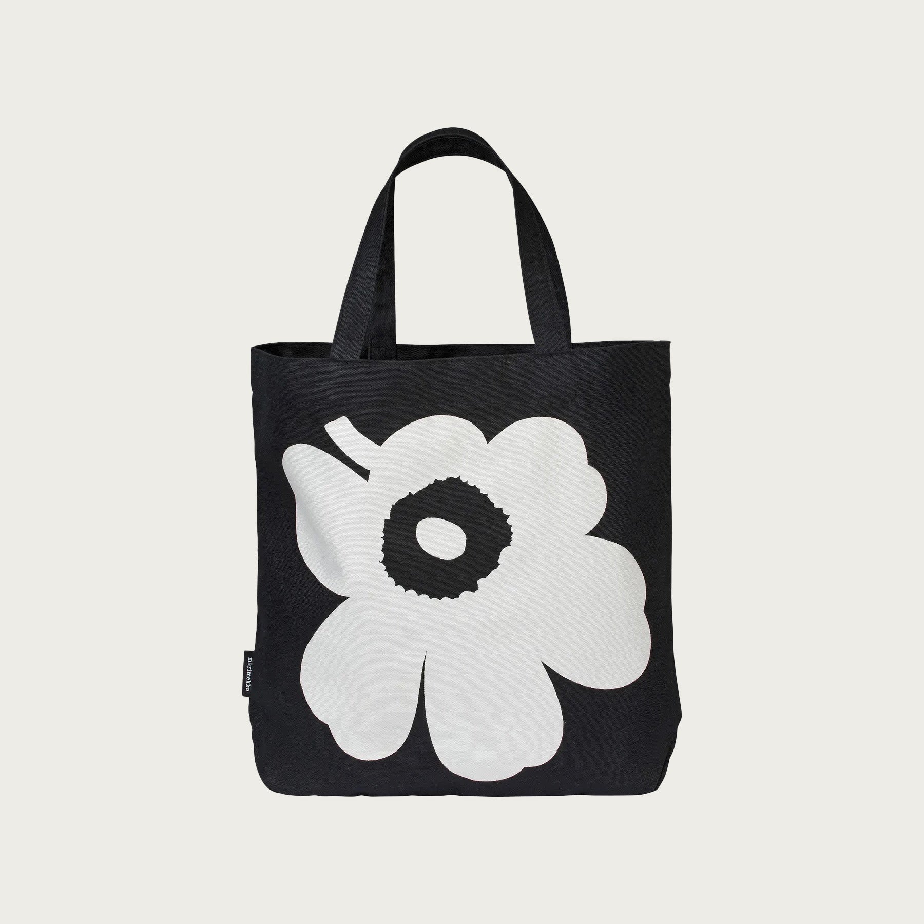 The black Torna bag is made of heavyweight cotton canvas. It has two handles, a pocket on the inside and it has the large white Unikko print flower on one side. The material is printed in Helsinki.