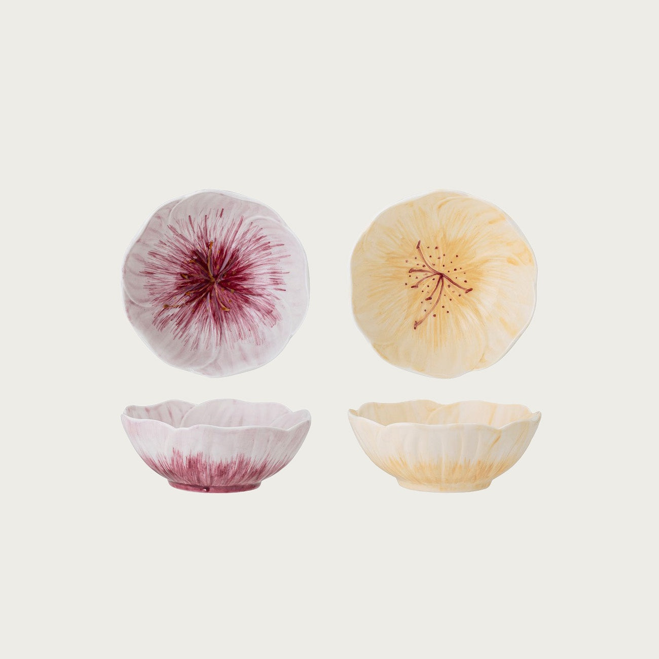 The Mimosa Bowl by Creative Collection is a set of 2 nice bowls made of stoneware. Mimosa is a cute serie of veggie bowls in all kind of shapes and sizes. You can make the nicest summer table with this very fine tableware. For summer salad or small snacks. Also perfect to spice up your everyday at home or in your summerhouse. Every piece in this serie is unique, and these bowls have the shape of flowers in nice purple, yellow and white colors.