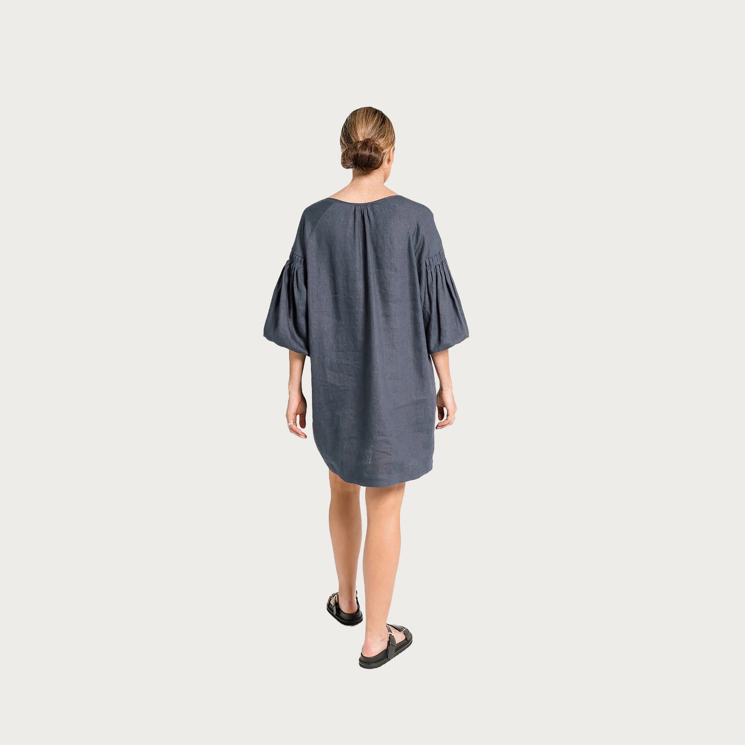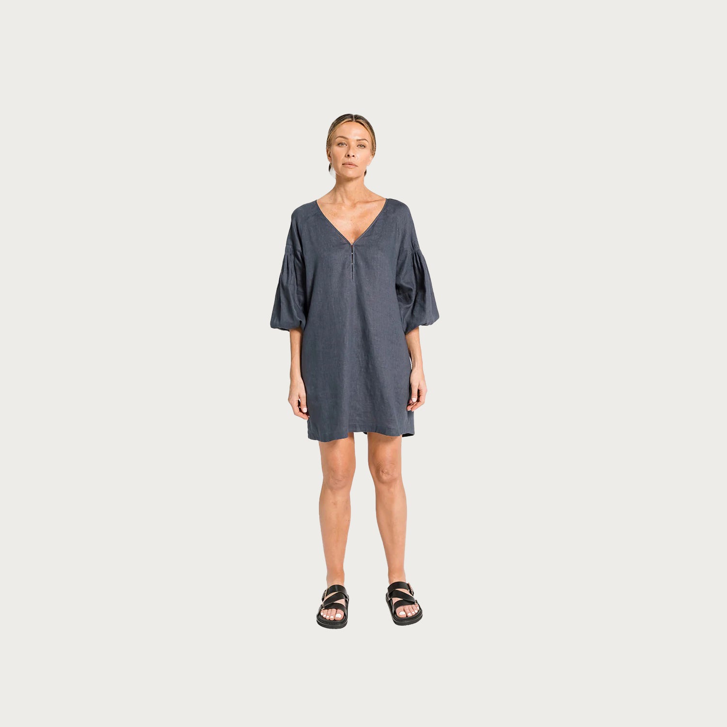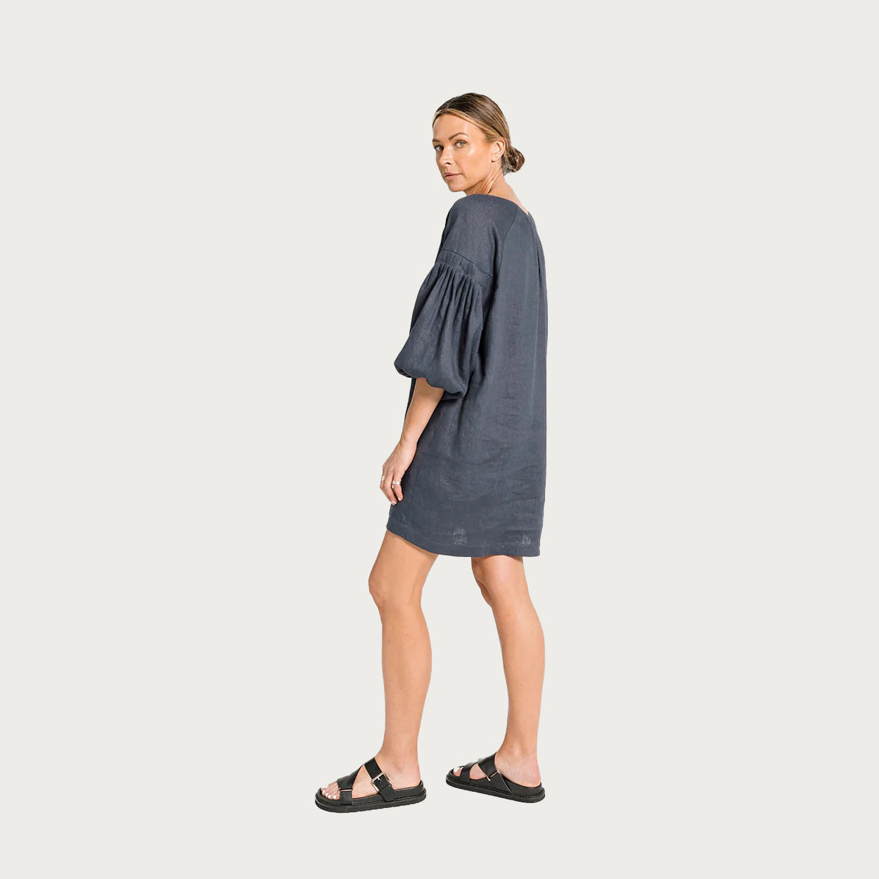 This will become your go to dress through the warmer months. The Nina is the holiday dress you have always searched for, striking the perfect balance of casual chic, you'll be ready for lunch, dinner or drinks at the beach bar. Crafted in 100% premium Linen. Beautiful signature pleat detailing cinches in on the arm at just the right place. Soft billow 3/4 elasticated sleeve. Hook and eye closures to the front keeping the look modern and minimal. Length is just above the knee to show off those summer sunkissed legs. Available in 4 colours: Black, Putty, Ivory & Ocean