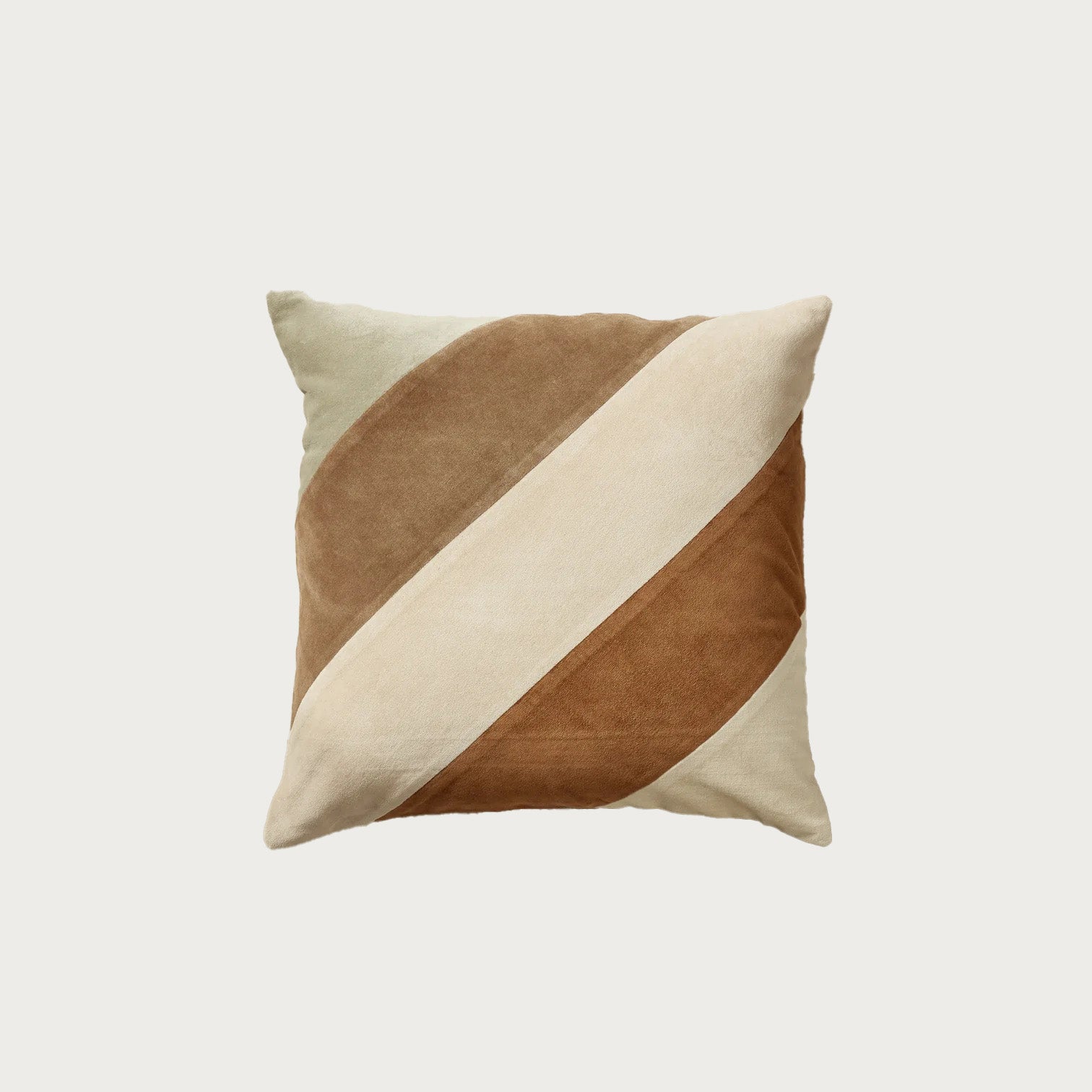This square cushion features a sumptuous velvet fabric adorned in diagonal striped patterns.