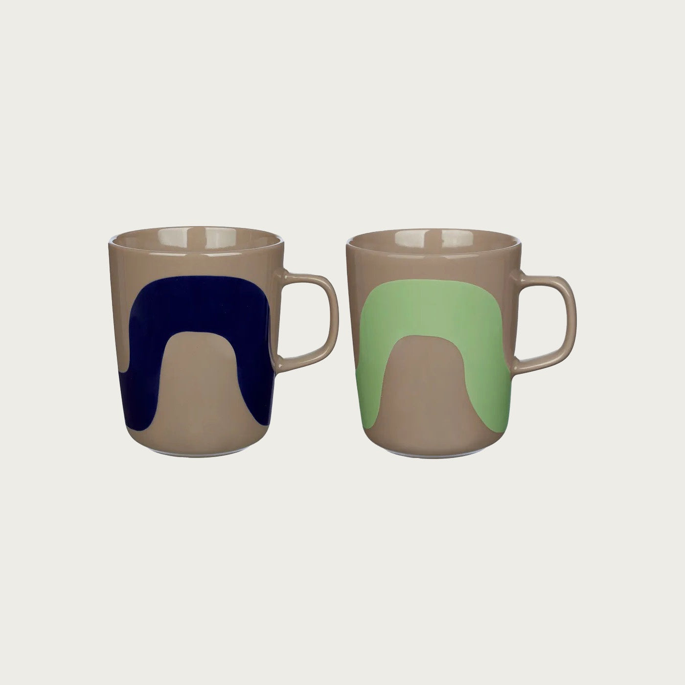 This set features two Oiva mugs made of brown stoneware. The mugs feature different coloured Seireeni patterns and they are dishwasher, oven, microwave, and freezer safe. The set is packed in a gift package.