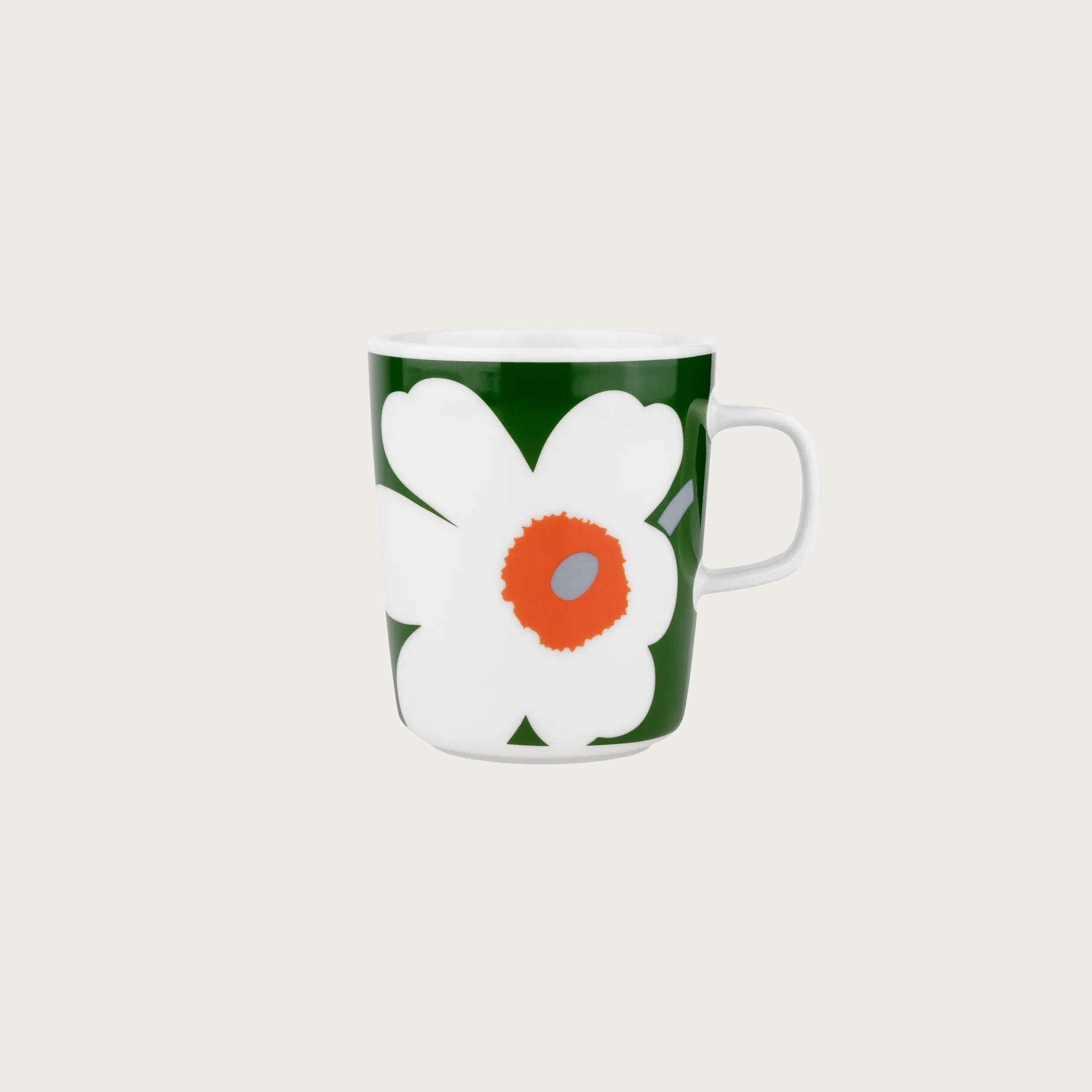 The Oiva mug is made of white stoneware, and it features the Unikko pattern. The mug is dishwasher, oven, microwave, and freezer safe.