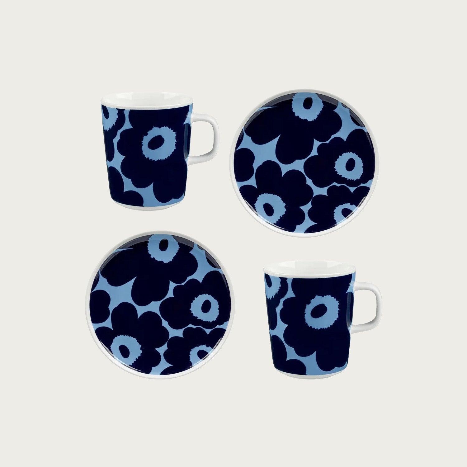 This Unikko breakfast set includes two Oiva mugs (2 x 2,5dl) and two Oiva plates (2 x 20cm . The dishes are made of white stoneware, which is dishwasher, oven, microwave, and freezer proof. The set is packed in a Marimekko Logo gift box.