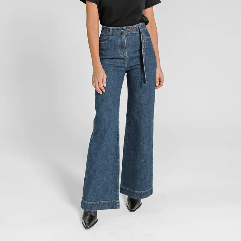 A long awaited denim version of our best-selling Sienna Pants! Crafted with subtle stretch in the denim for extra comfort. Style with or without the included covered self-belt. Style with our coordinating Isla Denim Shacket or our Lara Shirt Dress in Navy. Dress up or down!