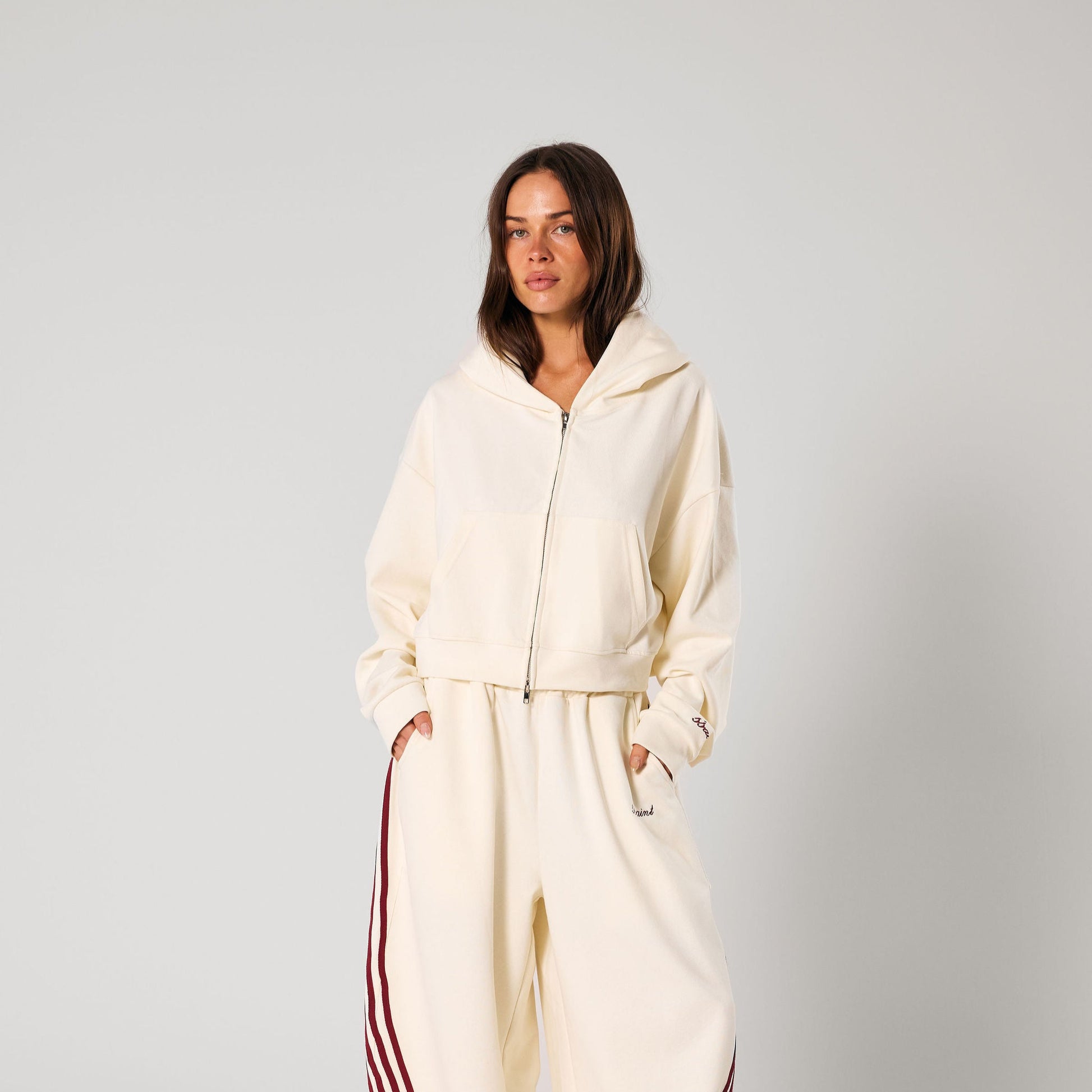 The SŚAINT Cropped Hoodie in Butter combines a relaxed, oversized fit with a clean, cropped cut. Made from a cotton-blend, it features a zip-up front, dropped shoulders, and subtle sleeve embroidery—an effortless everyday staple that can be styled on its own or paired with the SŚAINT Barrel Pant for a complete, elevated look.