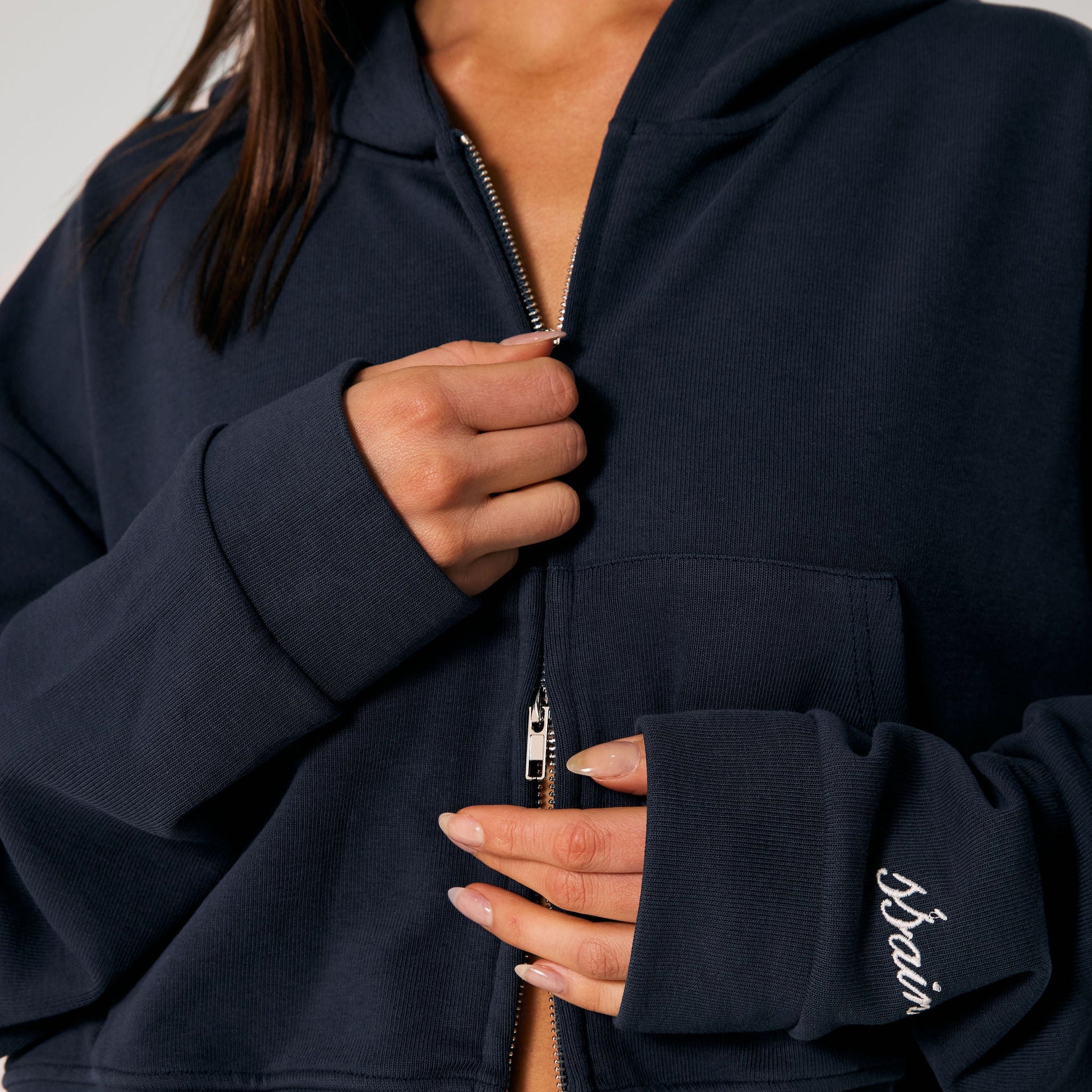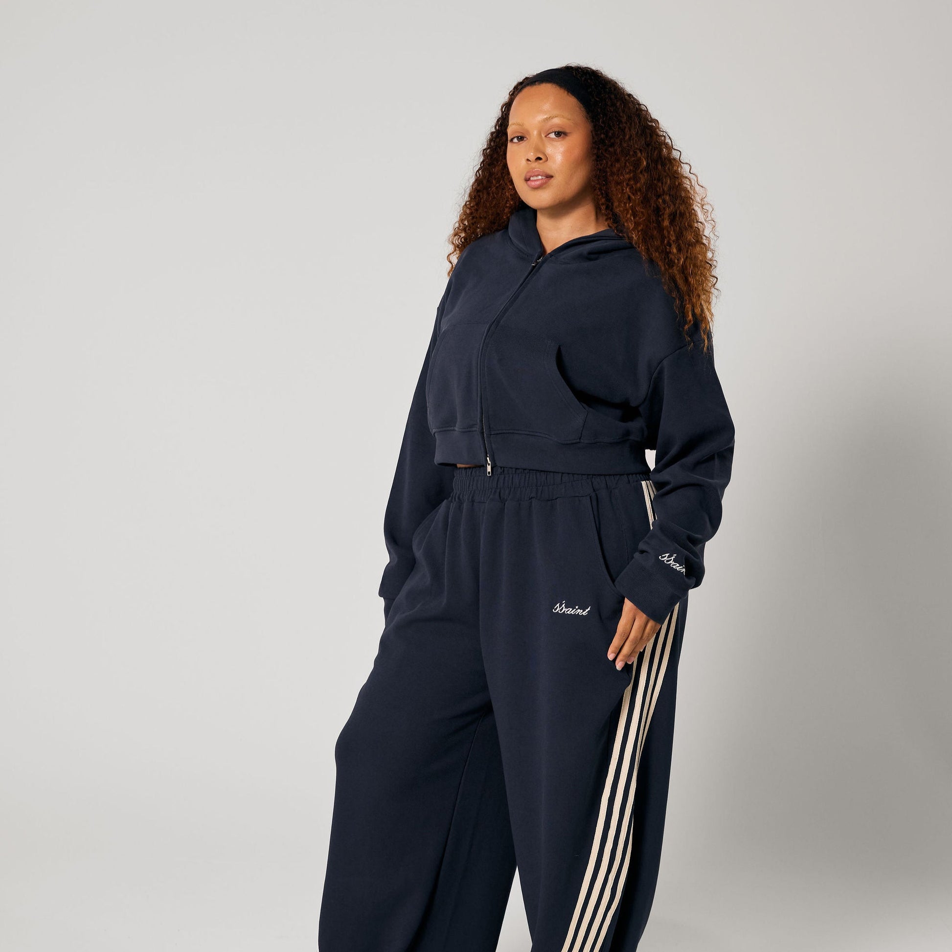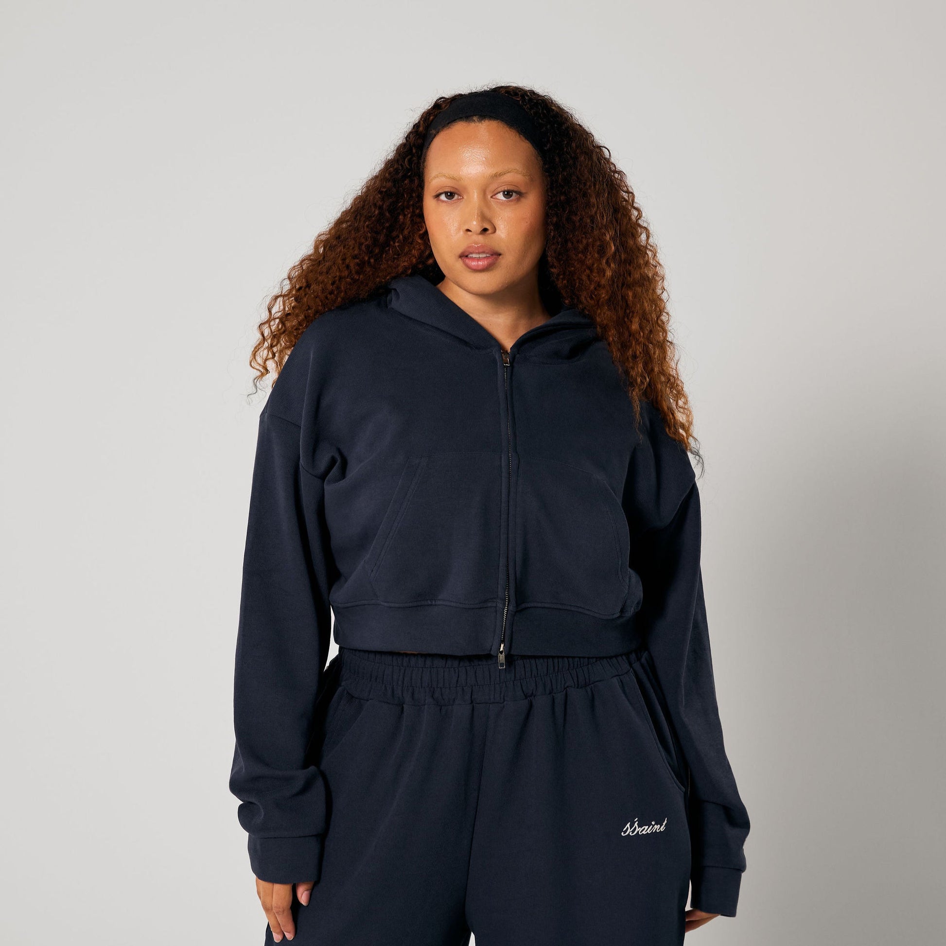 The SŚAINT Cropped Hoodie in Navy combines a relaxed, oversized fit with a clean, cropped cut. Made from a cotton-blend, it features a zip-up front, dropped shoulders, and subtle sleeve embroidery—an effortless everyday staple that can be styled on its own or paired with the SŚAINT Barrel Pant for a complete, elevated look.