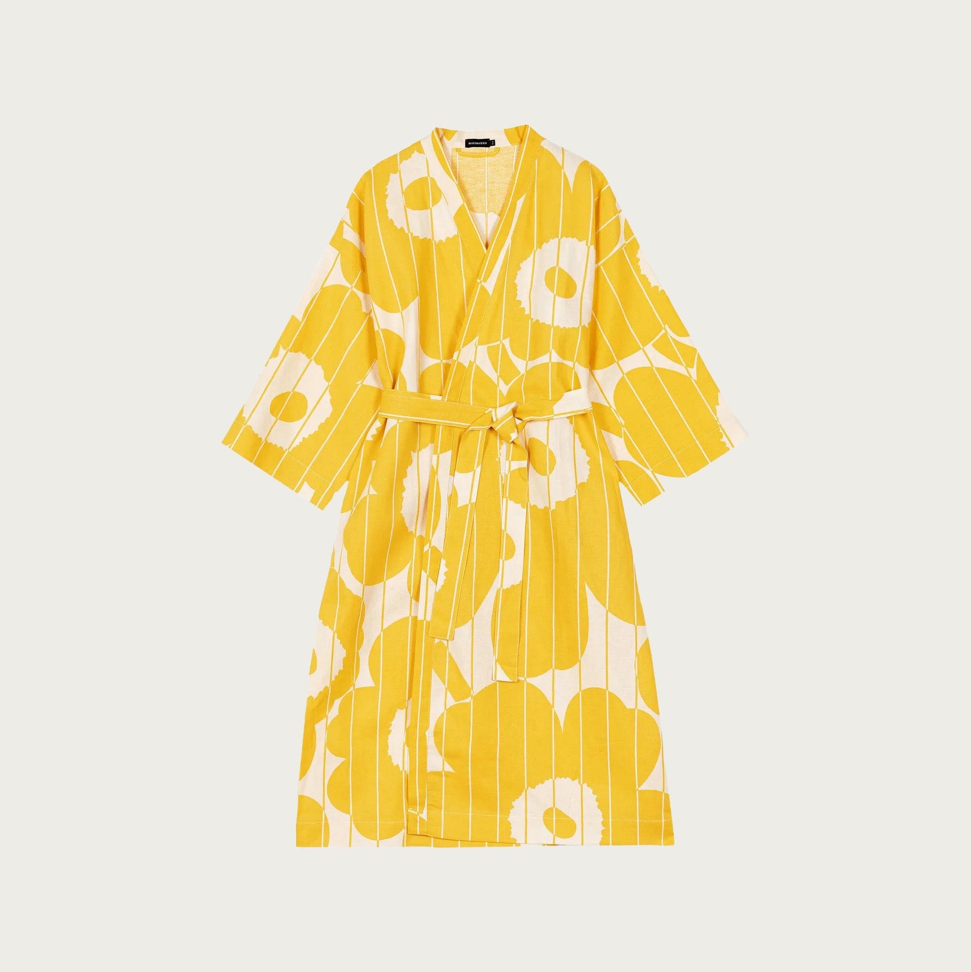 This beach robe is made of cotton-linen blend waffle in the Vesi Unikko pattern. The robe has long, loose sleeves that have wide turn-ups at the sleeve ends. The kimono-style beach robe has side seam pockets and a detachable belt.